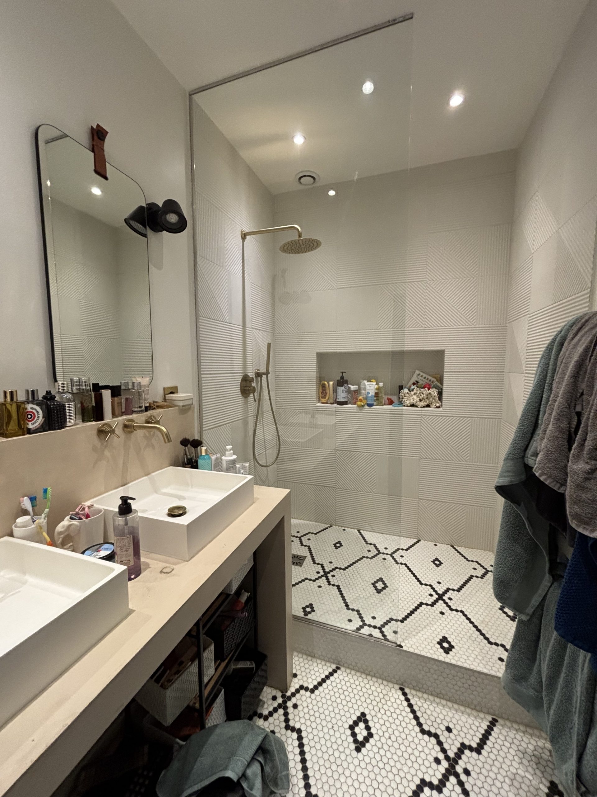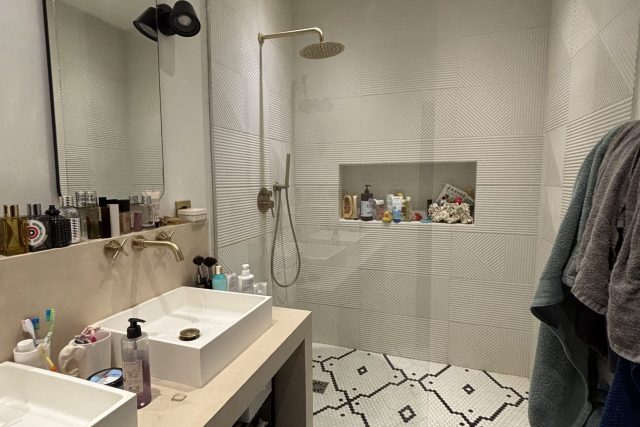 Une double réception avec cuisine américaine, une salle de douche, trois chambres, un wc séparé.